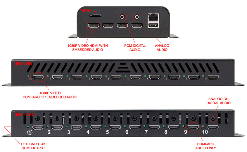 How about MH10 series video? While the MH10-HD can support one or more 1080p TVs on any of its 10 outputs, the ten HDMI-ARC ports on the MH10-ARC do not support video at all – instead, its 11th HDMI output is designated for a 4K video display.